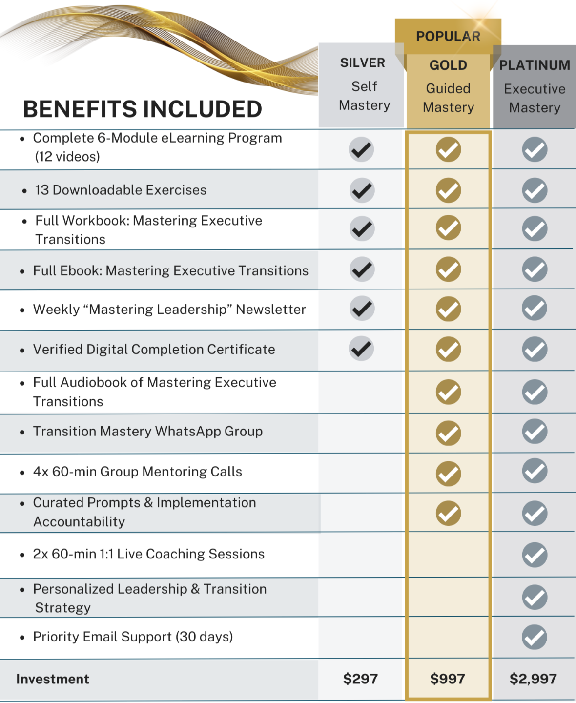 Mastering Leadership Transitions is a structured, practical, and research-backed eLearning program designed to help leaders navigate career change with confidence and control — whether stepping into a new leadership role, expanding scope, or redefining their leadership impact. This is not theory. It is a repeatable system used by leaders across industries and geographies.